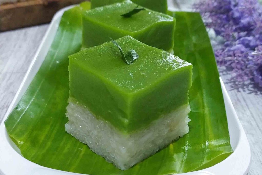 3. Tuang adonan putih ke atas adonan hijau yang sudah dikukus terlebih dahulu, isi hingga permukaannya penuh.